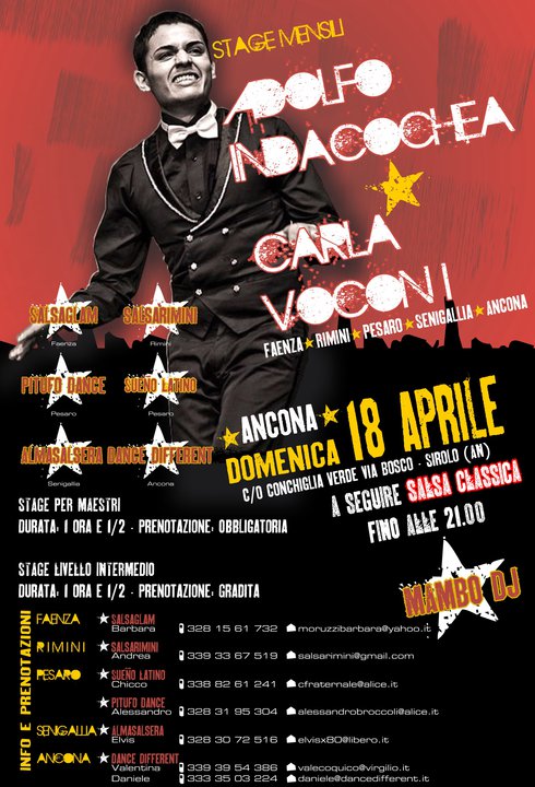 | More | Saturday, November 13, 2010 Gala salsa classic "salseros4ever" Hotel Regina - Porto Recanati (MC) Dance evening The event will begin at 22:45 and ends at around 4:00 respective event with salsa clasica mejor ... ♫ ♫ ♫ ♫ ♪ ♪ ♫ ♫ ♪ ♪ ... loads loads loads gracias to the wonderful ... :-))))))) ... ☻ ☻ ☻ salsa en vinyl: ♦ Ivan El Conde dj from Taranto, lasalsavive host of events, the 2nd dj salsa contest in San Remo (vinyl event ) of Salsitaly in Pescara and numerous social salsa classic in Italy ... exhibitor at the show on the 7th birthday of vinyl lasalsavive ... ♦ Mambo DJ (Max Ciarafoni) Sirolo by (an), host of events and numerous social lasalsavive of classic salsa, ... exhibitor at the show on the 7th birthday of vinyl lasalsavive ... ... ☻ ☻ ☻ salsa en cd: ♦ Andrea Barchiesi dj Perugia, directly from the best salsa classic The Barr Bastia Umbra, lasalsavive host of events and numerous social salsa classic school teacher of salsa Salsamundo perugia ... ♦ Estefano dj (Stefano Dariozzi) from the best local Marches Riviera (MYM - Civitanova; MISUSE - San Benedetto, IL GRILLO; Porto San Giorgio ...), host numerous social salsa classic ... Info price: - evening of dance with a drink: 10 € Info and tables: - alex: 3478663653 - clear: 3479436741 Location: Hotel Regina Portorecanati SS Adriatica 62017 Porto Recanati (Mc) - Italy Tel 071/9799212 Fax 071/9797388 How to reach the hotel By car: Motorway A14 Loreto - Porto Recanati, Porto Recanati South direction - Pescara, 3 km along the National Road . TRAIN: station of Porto Recanati. From there, take the urban bus service (2 km). WIDE FREE PARKING If you have a satellite navigation system, enter "Via Caravaggio." http://www.hotelristorante ... Just4salsa anhelo you ♥ ♥ ♥ |